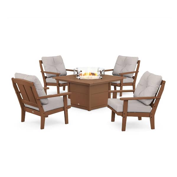 Mission 5-Pieces Plastic Patio Fire Pit Deep Seating Set in Teak with Dune Burlap Cushions