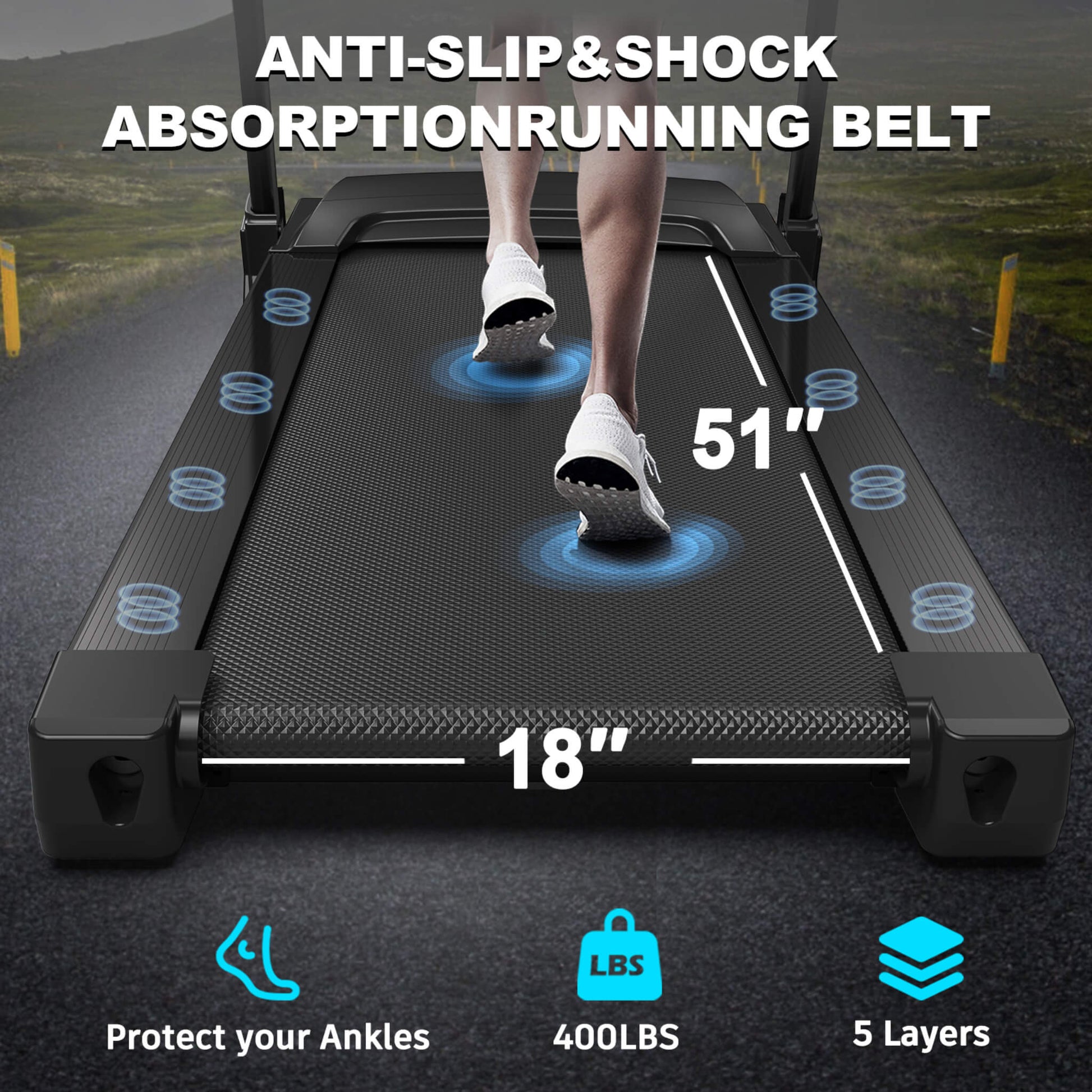 Shock-Absorbing Belt: 7-layer running surface simulates real-road running for added comfort
